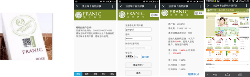 CCN中商為法蘭琳卡提供防偽營銷雙碼合一,形成碼上防偽+積分兌禮+品牌宣傳+系列產(chǎn)品推介一站式營銷模式,打造品牌會員積分俱樂部,提升消費者消費積極性及復購率,以碼為入口捕捉消費者畫像,為后期精準營銷提供數(shù)據(jù)基礎。